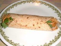 2. 180℃のオーブンでトルティヤを温める程度に焼く。鳥肉は一口大に切ってフライパンで炒め、塩・こしょう・しょうゆ少々で味付けする。
