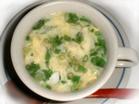 2. 片栗粉を水でといて加え、煮立ってとろみがでたらとき卵を流しいれ、卵がふんわりと固まるように大きく混ぜる。