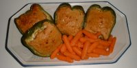 *上は、ミニ・カラーペッパー(黄色・オレンジ・赤のミニパプリカ)で。 下は、一見ふつうのピーマンの肉詰めです。が!これがかなり大きいのです。長さ10センチはあるかな?ひとつでもうおなか一杯というかんじです。 ちなみに英語でピーマンのことを「グリーンペッパー」といいます。