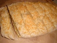 3. 生地を30センチX20センチ程度に伸ばし、1の中身を包んでとじる。とじた方を下にして油を塗ったオーブンパンに乗せ、よく切れるナイフで適当に切れ目を入れる。