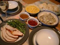*写真の左手前が薄切りにしたロースト・ターキー、その右にある小鉢の茶色い方がグレービー・ソースです。赤いのはクランベリー・ソース(クランベリー、砂糖、レモンを煮たもの)で、好き好きだと思いますが意外とターキーに合います。