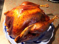 2.ターキーにレモンをこすりつけ、軽く塩・こしょうしてバターを塗る。アルミホイルを軽くかぶせてオーブンに入れ、20分後に温度を180℃に下げる。3時間半程調理する間、20分おきに残りのバターとベーキング・パンに出てきた汁をはけで塗る。