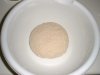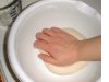4. 小麦粉を敷いた台の上に生地をとりだして手でこねる。べたつかなくなったら丸めてオリーブオイルを塗ったボールに入れ、固く絞ったぬれぶきんをかけて約1時間ねかせる。 (写真はそのままボールの中でこねてます。)