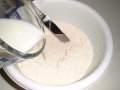 | 3. 牛乳と水を混ぜたもの(表面に塗る分を大さじ1杯くらい残しておく)を加えてさっくり混ぜる。このとき、決して混ぜすぎないこと。 |