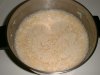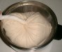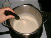 6. にがりをカップ1のお湯で溶き、軽くかきまぜながら豆乳に回し入れる。 全体的に豆乳が固まって沈殿してきたらそのまま15分待つ。