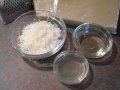 1. ビーズワックスはナイフで削るか、チーズ用のおろし金で細かくおろす。非常に硬いので、手を切らないようにご注意。