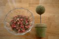 | <用意する物> 今回は、以前ドライフラワーのアレンジメントを作った時に余った花びらと、市販のトピアリー型を使います。(写真中にはありませんが、隙間をうめるのとアクセントの目的でラベンダーとカスミソウも使いました。) | |