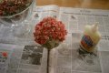 9. ちょっとデコレーションを足して、完成!**ひとこと** 足元にはボンドでこけをつけて、その上に花びらを散らしてみました。 茎の部分にラフィアを巻いて、リボン結びすると、ちょっとしたアクセントになります。 仕上げに、ドライフラワー用の保護剤をまんべんなくスプレーすれば色落ちや汚れを防いでくれる上、持ちもよくなります。 (右のアレンジメントを作った時の残りの花びらを使いました。) | |