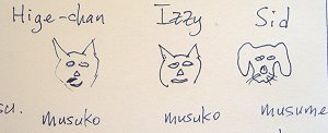 何だろうと思ってよく見てみると−−− ↓拡大 ![]() 白目だ。 まるでちびまる子ちゃんが顔にタテ線はいったときのようだ。しかも薄笑い。(下の『息子』『娘』という注釈にもご注目) 夫に「黒目は?」と聞くと、「知らない」と答えた。アメリカ人の描くイラストって、だいたいこんなもんです。 (ひげちゃんのチャームポイントの『ちょびひげ』はちゃんと押さえてありました。 このイラストは夫に内緒でこっそりUPしたので、もし私の夫に会う機会があってもご内密にお願いします。) |